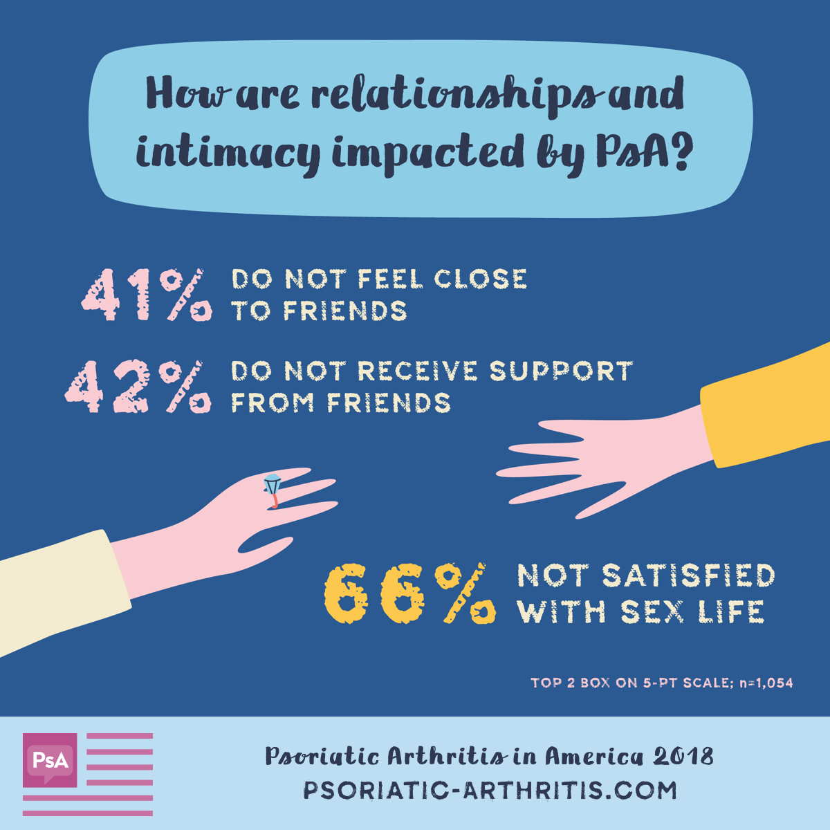 Beyond physical and mental well-being, social well-being is also impacted by PsA. Many people with PsA are experiencing intimacy issues as a result of their PsA diagnosis. They also feel as if they aren’t getting the support needed from friends to help cope with and manage their condition.